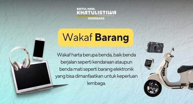 Wakaf harta berupa benda, baik benda berjalan seperti kendaraan ataupun benda mati seperti barang elektronik yang bisa dimanfaatkan untuk keperluan lembaga.